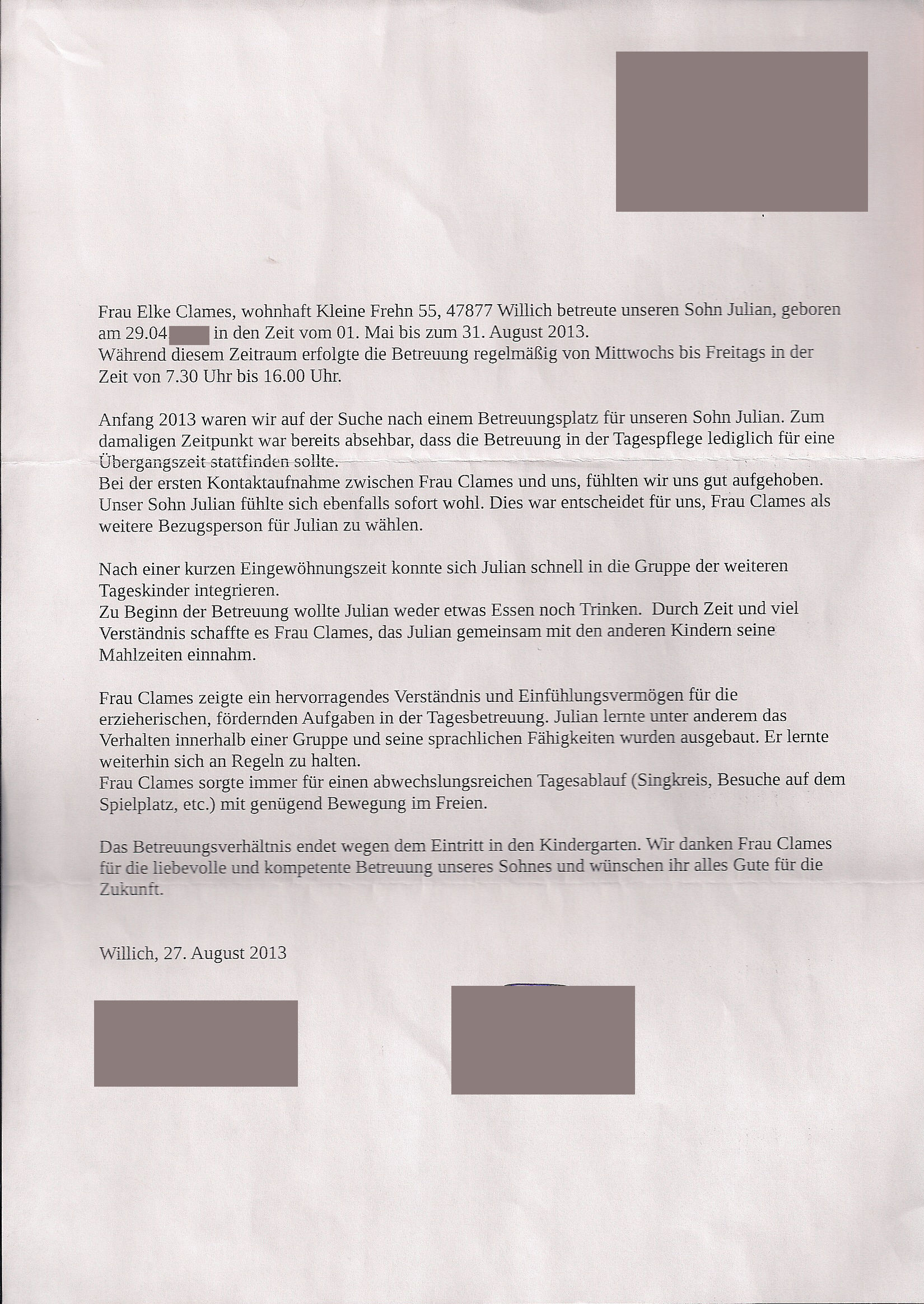 Folgend finden Sie Zeugnisse von Eltern, deren Kinder in meiner Betreuung untergebracht waren. Persöhnliche Angaben wurden, aufgrund des Datenschutzes unkenntlich gemacht.